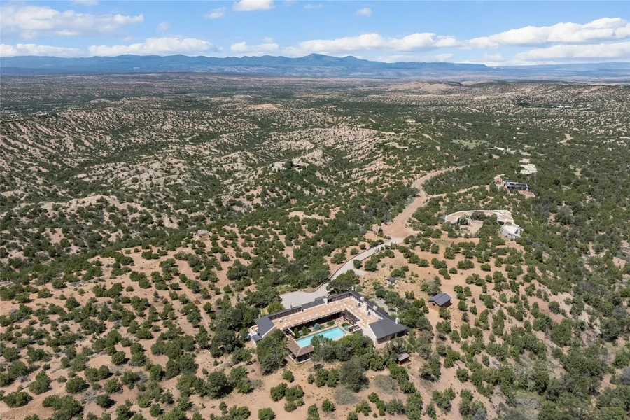 Tucked away in the foothills of Tesuque, this extraordinary Los Caminitos property offers traditional Spanish style architecture and miles of surrounding unobstructed sweeping vistas. The privately gated residence is situated on 16+ acres, and is sited around a courtyard swimming pool. The property features a main and guest house accessed off of a shared zaguan. The main house has a primary and guest bedroom, living room, family room or den, and formal dining room. The kitchen has been thoughtfully updated with new cabinetry, appliances, granite counters, and tasteful fixtures. The primary bedroom suite features views to the surrounding hillside, double walk-in closets, and a luxurious en-suite bathroom with a soaking tub and large walk-in shower. The generous guest house features a charming open-concept living/dining/kitchenette, two bedrooms, two bathrooms, and an office. The interior ...
