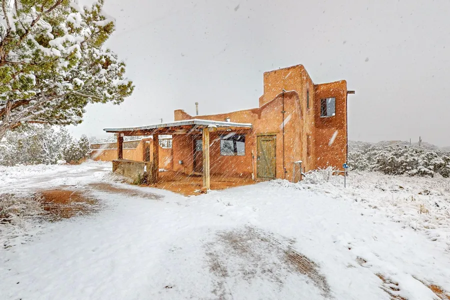 An adobe property with tons of potential resting on 3.5 acres in the desirable Sunlit Hills neighborhood, horses allowed, this home was lovingly built by the previous owner and is ready for someone to put their own personal touch. The 2 bedroom, 2 bath main home has views from the second floor bedroom and unique character including a beautiful old fireplace in the main living area, viga and beam ceilings, wood doors, and accents throughout. There is a spiral staircase to the second floor where one bedroom and one bathroom is located. The guest casita is a one room apartment with bathroom and small kitchenette, full of possibility for guests or a tenant. This home requires significant updates, and is ready for transformation into a truly Santa Fe style dream home. Bring your contractor!