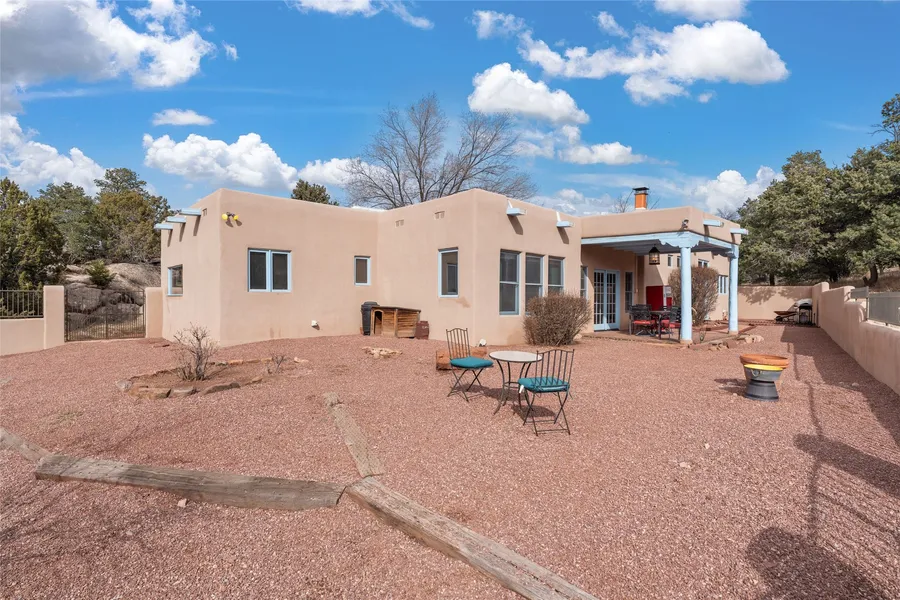 Beautiful, 15 Acre Horse Property nestled within a cozy valley surrounded by trees and boulder outcroppings, with main house & detached guest casita situated close to riding trails and just a 20 minute drive to Santa Fe. "Casa Caballos del Canoncito" offers Horse Lovers a spacious single level main house with traditional Santa Fe Style features and finishes: Vigas and Beams, Brick and Wood flooring throughout, Talavera tile accents, three bedrooms, two baths, spacious living areas, and an open concept 'great room' with Kitchen and Dining for family and friends to gather. Warm colored plaster walls, high ceilings, three fireplaces, skylights, and multiple living areas offer flexible entertaining and relaxation spaces and are highlights of the home. The detached Guest Casita has its own entrance, kitchen, full sized living area with fireplace, and a full bath. Horse Facilities include: 4 s...