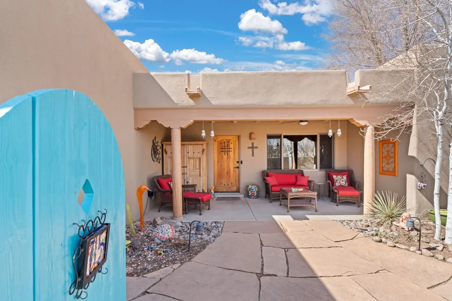 TALK ABOUT HAVING IT ALL!! This Eldorado beauty has wonderful mountain views and extraordinary outdoor spaces with hot tub, roof-top deck, built-in bar and BBQ, kiva fireplace, sun shades and a number of entertaining and seating options and a Bocce Ball court!. Kitchen features under cabinet lighting, hickory cabinetry, great storage, stainless appliances (range has never been used) and built-in desk area. Walk-in pantry has exceptional shelving and room for small appliances. Primary bedroom has viga ceilings, kiva fireplace and doors to rear portal and a library/media room/office is attached. A cedar closet and generous walk-in closet with drawers and shelves. Primary bath has double sinks, large jetted tub and separate shower. Silicone coating on roof in 2021 - six years left on the transferrable warranty. Single-level, no interior steps, in-floor natural gas radiant heat and two evapo...