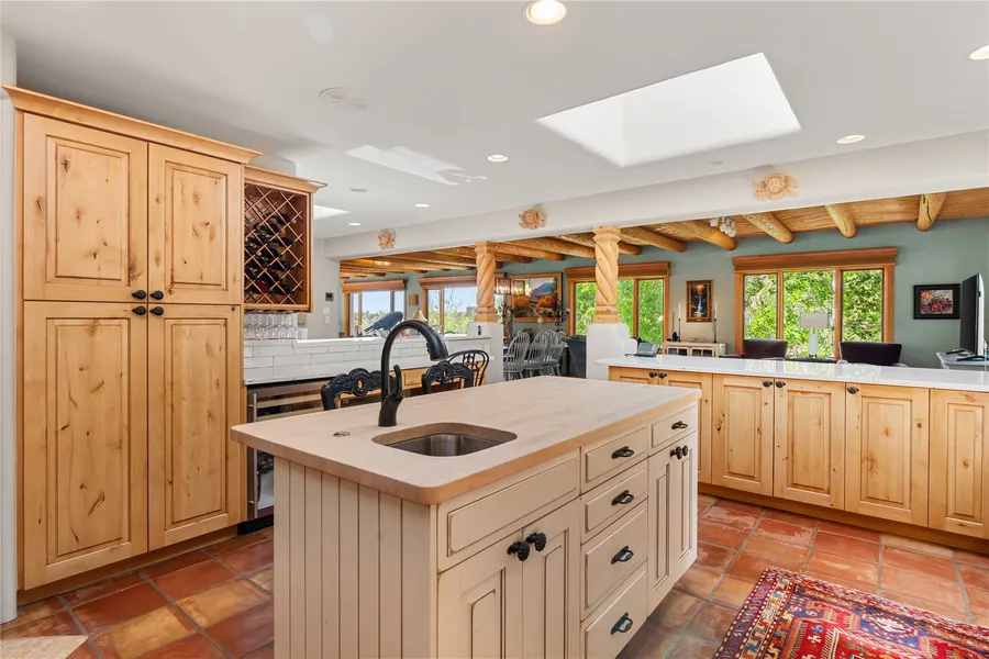 Situated on a large, secluded, and serene 2 acre north-side estate, an exquisite transformation has taken place. The two levels of the main house have been opened and expanded, resulting in a thoughtful home filled with natural light. Walls of windows look upon treetops, fabulous Jemez Mountain and sunset views, and abundant foliage and wildlife. The upper level incorporates the primary suite and two other large bedrooms, a large open concept kitchen and dining area, with Saltillo tiles and vigas flowing into the living area, capped by a dramatic kiva fireplace. For the newly imagined lower level, 1,843 sq ft were added to the original 5,307 sq ft house to create a second lower wing in the main house. The result - 7,150 sq feet with total of 6 bedrooms, remodeled upstairs kitchen, a new 2nd living room with an enclosed patio, 2 new bedrooms, a den with a kitchenette and fireplace, office space, a new laundry room, and too many other new and remodeled features to mention here. The flexibility of these spaces is abundant. Additionally, the property boasts a 1020 sq ft RV garage, recently converted into a heated and cooled artist’s studio. There is also a one bedroom casita and 2 two car garages. The guest house, art studio, and one 2 car garage have a separate address and a 2nd gated entrance and the property now totals an extraordinary 8,545 sq ft of heated space on 2 landscaped acres. An amazing value.