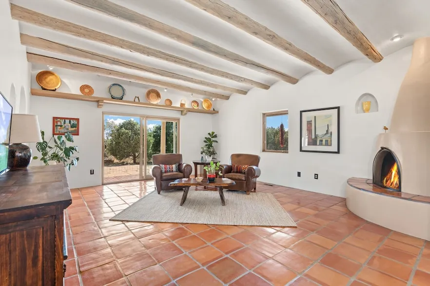 Welcome to your dream retreat: a 3,956-square-foot haven where classic Southwestern charm meets modern comfort. Located just minutes from downtown, this thoughtfully designed 3-bedroom, 3-bath home sits on 1.08 private acres with no HOA.Inside, you ll find Saltillo tile floors, hand-troweled plaster walls, and a generous living room with coved ceilings and abundant natural light. Clerestory windows and skylights fill the home with sunshine, and a sliding door opens to a stunning wraparound portal perfect for year-round entertaining or quiet evenings under the stars.The kitchen is a chef s delight with newer appliances, ample cabinetry, and a spacious walk-in pantry. A charming office features traditional vigas and a latilla ceiling, ideal as a serene workspace or studio.The primary suite offers a corner kiva fireplace, two walk-in closets, and a private portal entrance. The updated en-suite bath includes a deep jetted tub and custom tile. The guest bath features a colorful Mexican tile arch over the tub for added charm.A lovely newer addition expands the living space with hickory wood floors, two bright bedrooms, a stylish bath with sun shower, and a large den with a fireplace, wood stove insert, built-ins, kitchenette, and wet bar. One bedroom has its own portal entrance for added privacy.Modern comforts include forced air heat, refrigerated air, and in-floor radiant heat in the newer section. Outside, you ll find a one-car garage, two-car carport, and a versatile studio once used for pottery now a great workout space or creative workshop.This special home blends timeless Santa Fe architecture with thoughtful updates and artistic flair. More than a home it s a lifestyle.
