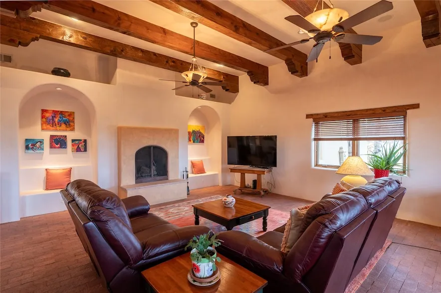 Near and Far. Within 10 minutes of shopping, airport, hospital, dining and more, but the rural environment feels far from town. An authentic adobe in a gated neighborhood, the 3814 square feet includes 595 square foot 1 bedroom guest apartment or amazing studio for artists and crafts people. A favorite feature is the master bedroom's 2 separated full baths each with their own walk in closets. The high beamed ceilings are simply elegant, as are the plaster walls, lovely wood finishes, and exquisit lit art coves . Bonuses include a den, an office, 5 fireplaces, a well appointed large kitchen, a 3 car garage plus workshop, mountain views, and privacy. The deep covered patio (portal) is perfect for all weather entertaining and relaxation. A easy commute to Los Alamos or Albuquerque. This is a must see home.