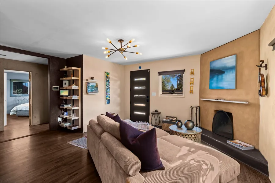 In the charming and centrally located Don Diego neighborhood, 622 Calle Grillo is a rare property with great character and flexibility. A two-bedroom main house and a detached one-bedroom casita sit opposite each other on a 0.15-acre lot, each with their own private and ample outdoor spaces. In an age of uniform whitebox houses, this classic build and styled home is refreshing for its connection to Santa Fe’s puebloan architectural roots. Lovingly owned and updated, the property has modern comforts and details wrapped in the warm colors and touches complimentary of its adobe and block construction. Exposed adobe and faux painted walls are the backdrop for an open living, kitchen and dining area that flows to the large backyard. Despite being in the heart of town, the mature landscaping, which includes 70-year-old rose bushes, a large Mountain Ash and gorgeous lilacs and fruit trees, create a treasured sense of privacy. The casita provides opportunities for a future owner, either as spacious guest accommodations or as an income generating asset for short or long term rentals. A short walk to the Railyard, the Cordova shopping center, and the Plaza make this one of the few homes that provide such great value within the epicenter of Santa Fe life.