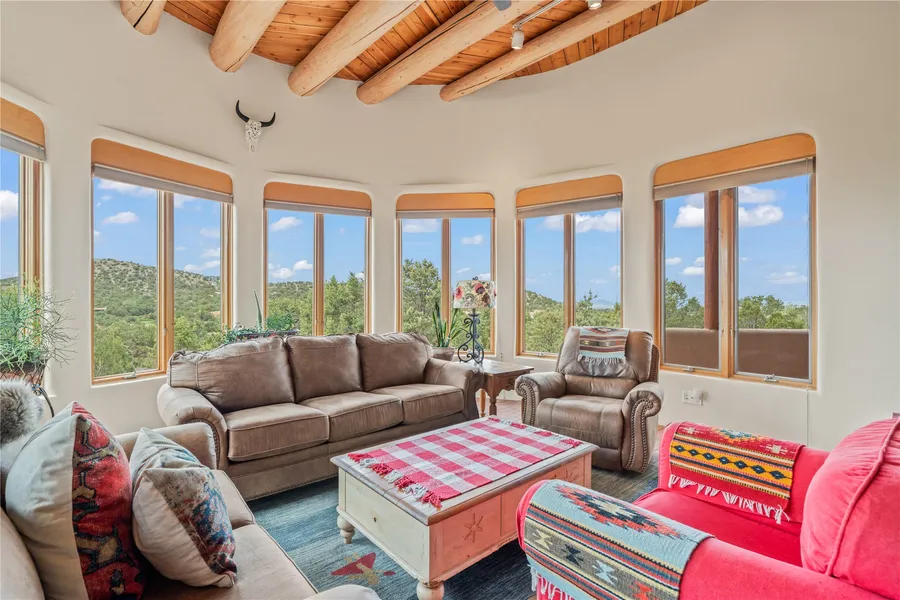 THE JEWEL OF ALTEZA ESTATES. Privacy and astounding views from this spectacular light and bright property with lush rose gardens and long-range mountain views from the entertainer's portal complete with fireplace. The sunroom's abundant windows open to a covered wrap-around portal which has many seating and dining options. Beautiful, remodeled cook's kitchen with quartz counters, Sub-Zero refrigerator, Wolf range with gorgeous maple cabinetry and pantry. Island has a prep sink and storage. Luxurious primary bedroom has room for a seating area, viga ceilings and a kiva fireplace. Spa bath has large separate shower, quartz counters, double sinks and a large walk-in closet. Dramatic living room with fireplace opens to dining room with handmade built-in sideboard. Two guestrooms and spacious guest bath with separate tub and shower. Generous fully fenced backyard. Landscaping all on drip. Four fireplaces. Pretty powder room. Walled front courtyard. All this on a paved road in a small, gated community. Approved ILR is in supplements and lot corners are flagged. Tankless water heater. Gorgeous Restoration Hardware entertainment center in living room conveys with the property. WIRSBO tubing in the floors, copper in the walls. Overzised and tall, finished 2-car garage with great storage. There is a spot for a casita. NO CARPET. NO KITEC. NEW SILICONE ROOF COATING JUNE 2025. Most of the furnishings can stay with the house if buyer wishes.