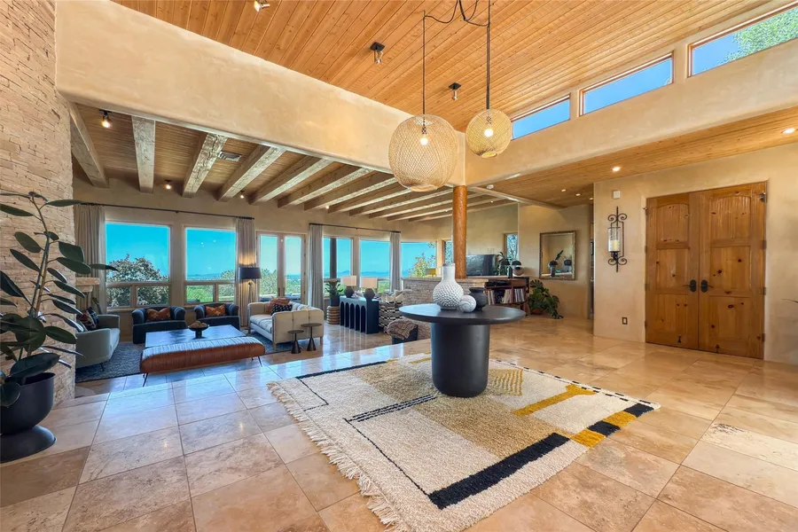 Embrace a lifestyle of sophistication and creativity in this stunning Northern New Mexico Compound that offers dramatic views of Sun and Moon Mountain. Situated on 2.5 acres, this special residence invites you to revel in the beauty of the surrounding landscape, with mountain vistas and city lights visible from indoor windows and the expansive 2,500 sq. ft. covered portal. A private quarter-mile walking path winds through the property, offering a tranquil way to connect with the land and enjoy the scenery. Gather around the outdoor kiva fireplace to enjoy views of the enchanting New Mexican nights. The property includes a main residence with two spacious bedrooms, a detached bedroom with a full bath, and a one-bedroom casita with a living area, kitchen, and full bath. In addition, there is a 100-year-old adobe studio. Inside the main house, the large great room is highlighted by soaring vigas and a striking, stacked stone fireplace that serves as the focal point. Culinary enthusiasts will delight in the generous gourmet kitchen, equipped with a central island and top-tier appliances. Retreat to the owner’s suite, featuring another stacked stone fireplace, a jacuzzi tub, and an infrared sauna with an open-air cold plunge pool. The outside space is complete with a cedar tub, outdoor shower, and fire pit. Convenience and comfort are enhanced with a whole house generator. Recent upgrades include a new boiler system, water softener, modernized electrical, a new pantry system, custom California Closets and more. Fully fenced yard with drip irrigation is enhanced by the recent planting of over 30 trees. Located minutes from the Historic Santa Fe Plaza.