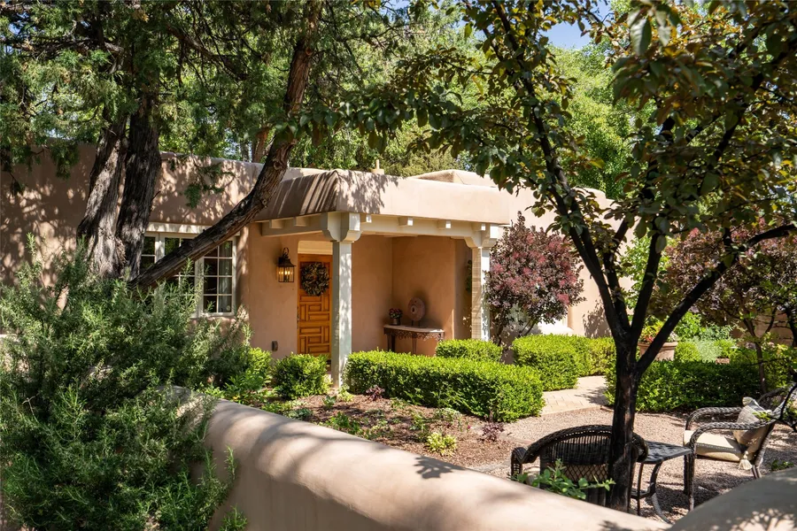THE CROWN JEWEL OF SOUTH CAPITOL | 4 bed, 4 bath, ~2400 square feet | Nestled on a tree-lined street in Santa Fe’s coveted South Capitol neighborhood, this exceptional residence is a masterful blend of timeless Santa Fe charm and modern luxury. Surrounded by award-winning gardens, the property offers complete privacy, tranquility, and unmatched curb appeal. The main house features two bedrooms and two bathrooms, with elegant details throughout—original wood flooring, hand-troweled plaster walls, vigas, and a traditional kiva fireplace. The thoughtfully designed kitchen includes its own gas fireplace and high-end Sub-Zero and Thermador appliances, flowing seamlessly into the dining area and out to an expansive portal with a fireplace—an ideal setting for al fresco dining and entertaining. The spacious primary suite opens to a private portal overlooking the manicured grounds and a serene fountain. It includes a generous walk-in closet and a luxurious en-suite bath with radiant heated floors. The lower level offers a versatile studio space complete with a bar area and full bathroom—perfect for guests, creative work, or a home office. Multiple deep portals with brick flooring frame views of the lush landscaping, creating a seamless indoor-outdoor experience. This home is a rare opportunity to own a private garden sanctuary in one of Santa Fe’s most historic and sought-after neighborhoods.