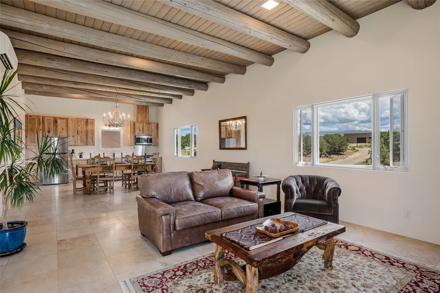 Light and bright two-bedroom home with large studio or guesthouse and Sangre de Cristo Mountain views. Set in a gated and peaceful compound between Aldea and Las Campanas, this beautifully designed home offers a rare combination of natural beauty, privacy, and versatile living. This 2,215 square foot residence, built in 2021 and feels brand new! The home enjoys a modern floor plan featuring high ceilings with light wood vigas, travertine tile floors, a gas fireplace and a lovely modern kitchen. The separate studio/office or guest house provides many options for a flexible lifestyle. Surrounded by pinon and juniper trees but just minutes from town, this property is a true Santa Fe retreat, set on 2.5 acres that provide dramatic sunsets, and the quiet serenity of open skies. The large windows welcome natural light for style and comfortable living space, perfect for relaxing or entertaining...