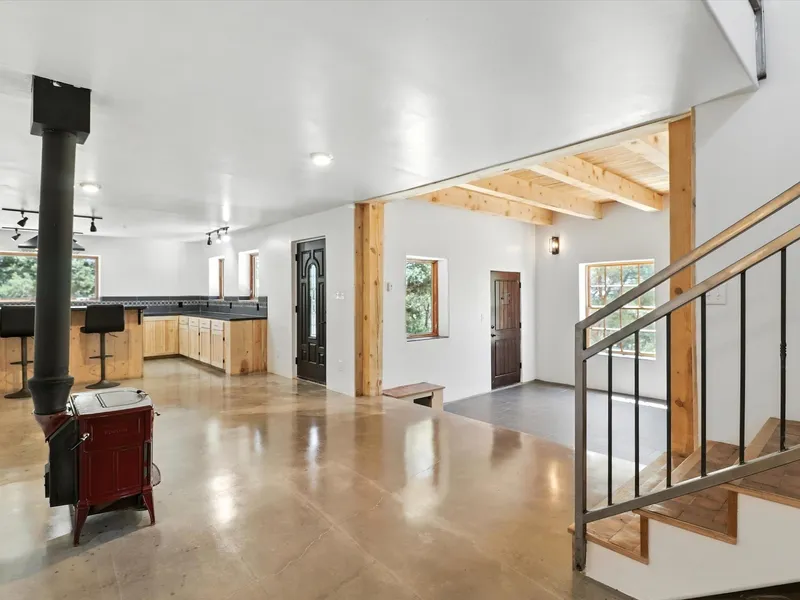 Modern Mountain Retreat Just off of Old Santa Fe Trail. A serene sanctuary nestled into the mountainside and surrounded with pines. This beautiful home offers breathtaking views of the green valley, the Shaggy Peaks and Pecos Mountains beyond-an ideal setting for those seeking peace, space, and connection with nature. With 3 spacious bedrooms and 2 full bathrooms, this home has a spacious living area perfect for relaxing, entertaining, and creating. The open-concept layout seamlessly blends the dining and kitchen spaces; all bathed in natural light from large windows that frame the stunning landscape. The kitchen is crafted for both functionality and style, making it the true heart of the home. Enjoy the comfort of a stone-tiled en-suite bath with a soaking tub and a cozy fireplace, a spacious walk-in closet, and private access to a balcony where morning coffee comes with inspiring Fores...