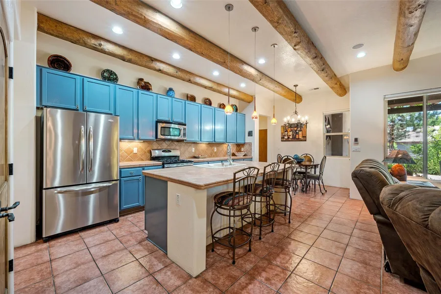 Exceptional 3-Bedroom, 2-Bath Home - Truchas Floor Plan Beautifully maintained and thoughtfully upgraded, this home showcases over $140K in enhancements completed prior to 2009 along with timeless design details. The Truchas Floor Plan is a popular single-level, split-bedroom layout designed for both privacy and flow-featuring an open central living space flanked by a secluded primary suite on one side and two guest bedrooms on the other. The private primary suite includes custom lighting, window treatments, and professional closet organizers. Architectural highlights include viga & beam ceilings, solid alder doors, a gas kiva fireplace, and insulated windows. The gourmet kitchen is equipped with stainless steel Maytag appliances-including a built-in microwave-plus a large sink, a 'Good Water' filtration system and softener, and abundant storage. The open living area includes built-in surround sound for the television system, ideal for entertaining. Year-round comfort is ensured with radiant heating, refrigerated air, and all-tile flooring. Additional features include an extended insulated garage and beautifully landscaped grounds with irrigation system, an extended covered portal for outdoor living, and security system with motion activated lights. Dryer replaced in 2022. Energy Star-rated for efficiency, with exceptional quality. Located next to a green space walkway to a children's park within Rancho Viejo, a master-planned Santa Fe community known for its scenic open spaces, village-style design, and over 12 miles of walking trails, this home offers both a peaceful setting and convenient access to shopping, schools, parks, and downtown Santa Fe.