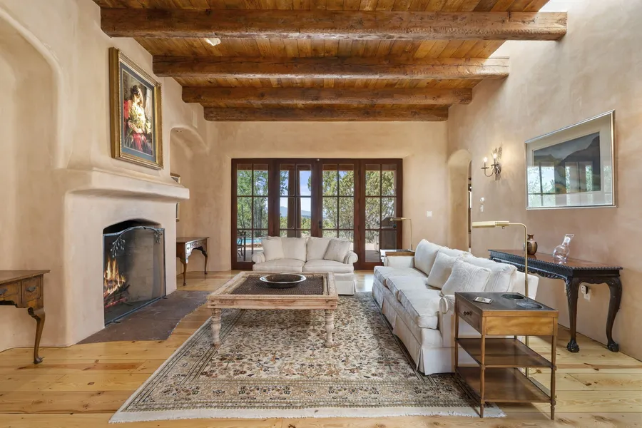 What kind of story are you ready for?? Santa Fe style meets European Country Estate! This 4 bedroom, 4 bathroom, high-quality Rastra construction features soaring ceilings, hand carved vigas, and far-reaching mountain views. Walking into the grand entrance, you are greeted by voluminous curved walls, golden-soft natural light, wide-plank pine floors, and a stately fireplace, which set the stage for an elegant Santa Fe lifestyle. The open concept French country kitchen faces a spacious den with views framed by large picture windows, and features an oversized island topped with granite. There is plenty of counter space for cooking and for entertaining guests. High-end appliances include a large Sub-Zero refrigerator, a six-burner Viking range, and a Bosch dishwasher. Additionally, this home's temperature-controlled wine cave accommodates 1500-2000 bottles for the serious aficionado. Relax in front of one of five fireplaces, and enjoy a large, formal dining room with views that will sweep guests off their feet! Or, linger over a morning cup of coffee on the grand portal overlooking the koi pond and the Jemez mountains. The lavish primary suite is on the main level and will have you living in luxury with a large deep, soaking tub, a private cedar-lined sauna, and a steam shower. There are several rooms downstairs (including a bathroom) which could be used as a mother-in-law suite, offices, or an artist studio. Complete with a TPO roof, an oversized two-car garage, and beautiful landscaping on drip irrigation, this is a timeless space you'll never want to leave. Rastra construction and owned solar panels create an extremely energy efficient environment, with almost non-existent electric bills. New stucco was done in 2025. Enjoy proximity to the club at Las Campanas, but without the high HOA fees. Don't miss this chance to live your dream Santa Fe lifestyle!