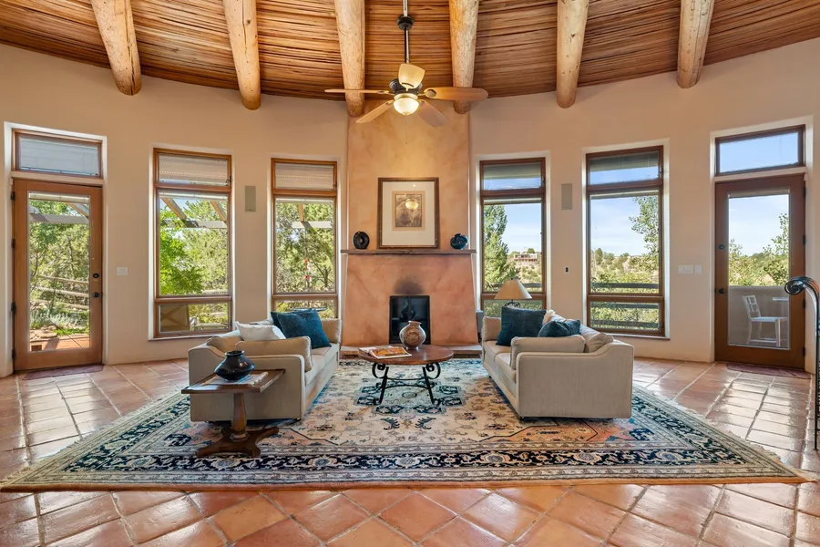 Perched high on a serene hilltop with commanding views of the Sangre de Cristo Mountains, this Santa Fe-style custom estate offers a masterful blend of artistry, comfort, and Southwestern soul. Just minutes from the historic Plaza yet nestled in a private enclave on a full acre, this 4,300-square-foot sanctuary embodies the magic of Northern New Mexico living. Step inside to sun-drenched interiors where massive windows frame mountain vistas. The dining room, with stenciled beams and a corner Kiva fireplace, is perfect for cozy evenings or elegant entertaining. The living room impresses with fan-shaped vigas, a dramatic fireplace, and custom mantle, flowing into a spacious kitchen with granite counters, island, gas stove, copper hood, skylights, and walk-in pantry. Two luxurious Primary Suites ensure privacy. The main-level suite includes a coved ceiling, updated bath, private den, and Fr...