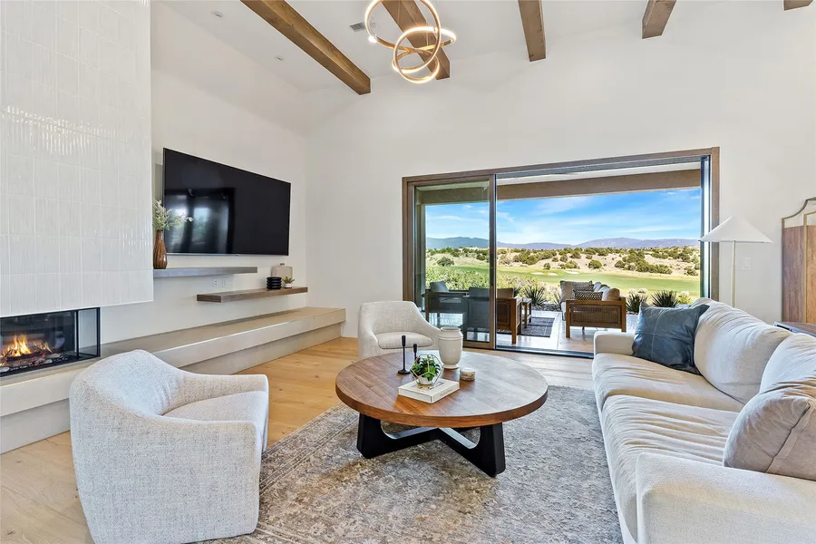 Welcome to 10 Calle Arbusto, an exceptional 2025-built custom contemporary masterpiece by the renowned builder, Clay Custom Homes. Recently completed and featured in the 2025 Haciendas Parade of Homes, this tranquil retreat is perched high above it all, offering breathtaking views of the 17th fairway at Sunset Golf Course and stunning Sangre de Cristo Mountain views. This rare offering showcases striking architecture paired with high-end designer finishes. Located within the famed community of Las Campanas, within close proximity to The Club at Las Campanas, (2) Jack Nicklaus golf courses, Spa, Swim, Tennis & Fitness Center, this home is designed to provide the ultimate indoor-outdoor living experience, ideal as a primary residence or a luxurious secondary retreat. The single-level, open-concept layout features a spacious living room with a wet bar and wine cooler, gas fireplace, sliding glass doors and a spacious dining area that seamlessly extends to outdoor living spaces, including a covered portal with an outdoor fireplace. The state-of-the-art island kitchen boasts expansive mountain and golf course views, rich cabinetry, tambour wood accents, a walk-in pantry, and top-of-the-line Dacor appliances and (2) dishwashers. The generously sized owner’s suite delights with views, portal access and a spa-inspired bathroom with a glass walk-in shower, soaking tub, and a large walk-in closet. The separate guest wing includes two ensuite bedrooms and a versatile living room, perfect for accommodating guests, or a media room. Additional features include a private dedicated office, built-in BBQ/grilling station and outdoor kitchen, wood flooring, exotic stone countertops, abundant natural light, rich beam accents in the living room, and an oversized 2 car garage. This home exemplifies the pride and craftsmanship that embody the true Santa Fe lifestyle. Membership to The Club at Las Campanas is optional and by invitation only, though required to access all Club amenities.