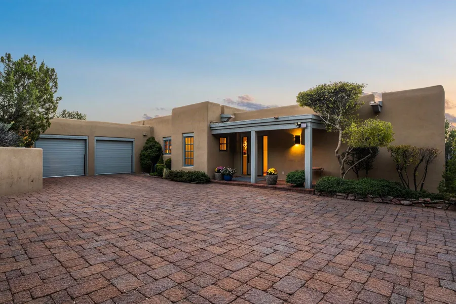 Nestled in a private gated neighborhood just five minutes from Canyon Road, this stunning 3-bedroom, 3-bath residence captures the essence of Santa Fe living with breathtaking views and refined details throughout. Arrive via a paver-lined driveway leading to a spacious two-car garage and be welcomed into a home built for both comfort and sophistication. Inside, French limestone imported from Forte dei Marmi flows seamlessly throughout, complemented by exquisite diamond finished plaster walls that add depth, texture, and timeless elegance. The expansive floor plan opens to over 800 square feet of covered portals, perfect for entertaining or savoring quiet evenings while soaking in the dramatic vistas. The gourmet kitchen is appointed with high-end finishes and appliances, designed to satisfy both everyday living and special occasions. Each bedroom offers privacy and comfort, complemented ...