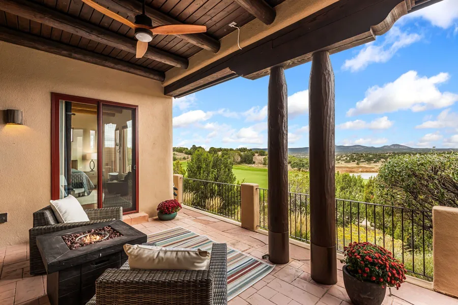 AMAZING VIEWS! Panoramic golf course, lake, Jemez Mountain and sunset views from this beautiful 3 bedroom & 2 bath Las Campanas home. Situated on an elevated lot overlooking the 14th fairway of the Jack Nicklaus designed Sunset Golf Course, this thoughtfully designed home is ideal as a permanent residence or turn-key second home. Wonderful open concept living is anchored by the cozy kiva fireplace on one end…and on the other a beautiful chef’s kitchen where you’ll find the spacious island with hammered copper farmhouse sink, top of the line appliances, generous pantry and beautiful dining area. Expansive windows capture the views, with French doors leading out to your covered portal for ideal outdoor entertaining. Your spacious Primary Suite enjoys those same incredible views and access to the portal, a spa-inspired bath featuring a jetted tub, walk in shower, double vanity and generous walk in closet. The Guest accommodations are nicely separated for privacy. Beautiful design features throughout… niches and built in shelving to showcase your art, classic vigas, cozy built in seating, roll down sun shades, custom doors & custom cabinetry. Additional highlights include new roof installed 2024 (transferable warranty), new refrigerator, new hot water heater, new patio railings and courtyard gates. Make this your ideal Santa Fe retreat!