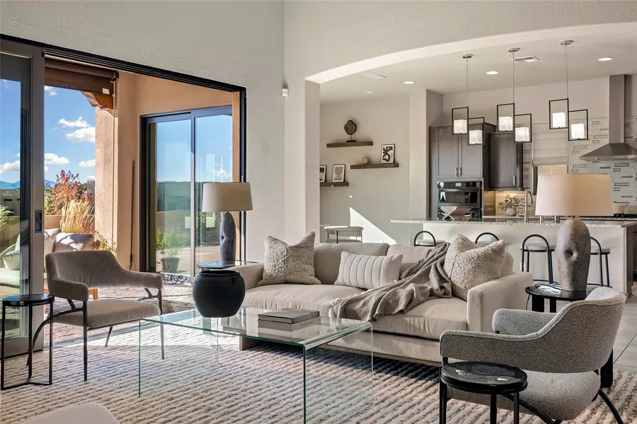 Live the Ultimate Las Campanas Lifestyle. Beautifully sited on a premier elevated corner lot, this exceptional 4-bedroom residence captures breathtaking Jemez Mountain and dramatic sunset views. Located within walking distance of The Club at Las Campanas, this home perfectly blends sophisticated modern design with the timeless essence of Santa Fe. The thoughtfully designed floor plan impresses from the moment you enter, featuring a spectacular living room ideal for both relaxed living and grand entertaining. Western views frame the space, while a modern gas fireplace with stone surround and mantle, and retractable glass doors, create a seamless indoor-outdoor living experience. The chef’s island kitchen delights with a generous natural stone breakfast bar, modern appliances, and a large walk-in pantry. This culinary haven flows effortlessly into both a gracious formal dining room and a c...