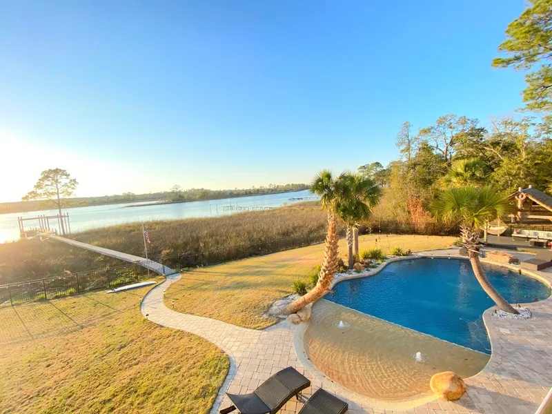 Southern Living at its best!This gorgeous coastal home, complete with expansive porches, plantation doors, and a separate three car garage carriage house sits on well over an an acre, with 196 feet of waterfront, along the Blackwater Bay. The newly upgraded private dock is perfect for fishing, and houses a boat slip that can accommodate up to a forty foot boat. Lush landscaping surrounds the saltwater pool that features a walk-in beach entry, complete with multiple fountains and custom lighting. As you walk through the front entry you are met with soaring cathedral ceilings, an open floor plan, and multiple picture windows with stunning water views. The Kempas hardwood flooring leads you into the kitchen which boasts custom cabinetry, granite countertops, high end stainless appliances, and a gorgeous island with built in stovetop and prep sink. There are two expansive downstairs masters,...