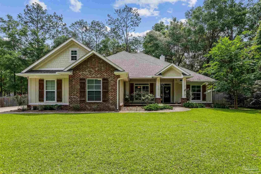 Welcome to this beautiful home built by Highland Construction Group. This floor plan is one of their most popular house plans, designed for people who are drawn to comfort and prestige. Situated on a 1 acre wooded lot. Great views of the private back yard can be enjoyed from most rear windows. As you arrive you will notice the undeniable curb appeal, accentuated by cedar boar siding, window shutters, flower beds, a very spacious front porch, and decorative front glass door. The first thing you'll notice as you enter the home, is the elegant wood floors on foyer and formal dining room, and the vaulted ceilings through the main areas. The living room will be the place to gather with loved ones. The wood burning fire place will set the ambiance on those few last chilly nights before summer. The chef of the house will delight in the functionality of the kitchen. An expansive center island will welcome gatherings, facilitate food preparation and provide extra storage. The beautiful granite tops extend to adorn the abundance of cabinetry. A large walk in pantry and stainless steel appliances complete this beautiful kitchen. For dining options, this home offers a breakfast bar, breakfast nook and a formal dining room. The owner's suite is situated on a private corner of this floor plan. Offers high ceilings, sitting area and French doors to lanai. The main bathroom offers double vanity with granite tops, oversized tiled shower with dual shower heads and built in tile bench. The 6ft soaking tub will become the favorite place to unwind at the end of the day. The enormous walk in closet has direct access to laundry room, which is also oversized, has cabinets and utility sink. The additional 3 bedrooms are very generous in size and offer ample closet space. The back yard offers a covered lanai, natural wooded area, irrigation system and privacy fence. Additional features include: hurricane protective devices, RV plug, gutters, attic space with floor, and many more extras!