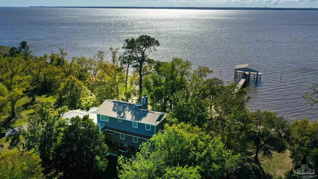 Enjoy spectacular sunsets and ideal waterfront living in a quiet, peaceful setting. This custom-designed, one-owner 4 bedroom, 2 bath home solidly built with driven pilings, offers low flood insurance premium and superb energy efficiency. The 4.75-acre manicured lot has 157 linear feet of waterfront with natural beach and shared dock with at least 6,000-lb. boat lift and water supply to the end of the dock, beautiful oaks, satsuma trees, bottle brush bushes and strategically planted mature maple trees which provide either sun or shade, depending on the season. Other easy-to-maintain exterior features include: Hardie plank siding; dual covered roof of 2/3 shingles and 1/3 standing seam metal for architectural interest; 2 screened areas, storage for tools, fishing gear, etc., and covered parking below; and a large, shaded deck. Hop in your boat, and head either up the River or out to the Gulf! The interior is equally well-planned and features: hardwood floors in main living areas; custom-built cabinetry and ceiling fans throughout; all stainless steel kitchen appliances; spacious office off the master bedroom with views of the trees or water; and granite/quartz counters. There is an abundance of natural light throughout the house with windows and doors leading out to the private, natural surroundings. Yet, you are only a short drive South to Gulf Breeze and Pensacola/Navarre Beaches or North to I-10 and downtown Pensacola.