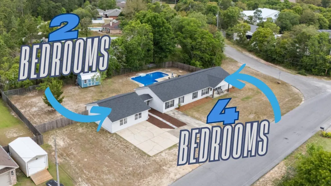 Welcome to an incredible opportunity in East Navarre! This versatile property sits on a spacious corner lot and offers a rare combination of space, functionality, and flexibility perfect for investors, multi-generational living, or anyone who loves to entertain. With 6 bedrooms, 3 full bathrooms, and nearly 3,000 square feet between the main home and guest house, this property truly stands out. The main residence features an open, split-bedroom floor plan, with the primary suite privately tucked away on one side, and three additional bedrooms, a dedicated office, and a large laundry/flex/game/media room on the other. The living room opens through French doors to the backyard and the sparkling in-ground pool, creating a seamless indoor-outdoor flow perfect for gatherings. The guest house has its own separate entrance and is connected to the main home by a covered flow-through breezeway for added convenience. Inside, you'll find two more bedrooms, a full bath, a fully-equipped kitchen, and laundry hookups ideal for guests, extended family, or potential rental income. Situated on .59 acres, the property also offers a large yard building for extra storage and plenty of outdoor space to enjoy. Plus, you're just 14 minutes to Hurlburt Field and 10 minutes to the white sands of Navarre Beach, putting the best of the Gulf Coast right at your fingertips. Whether you want to live in one house and rent the other, host backyard BBQs by the pool, or build your investment portfolio with short- or long-term rental options, the possibilities here are endless. Don't miss this one-of-a-kind Navarre gem schedule your private showing today!