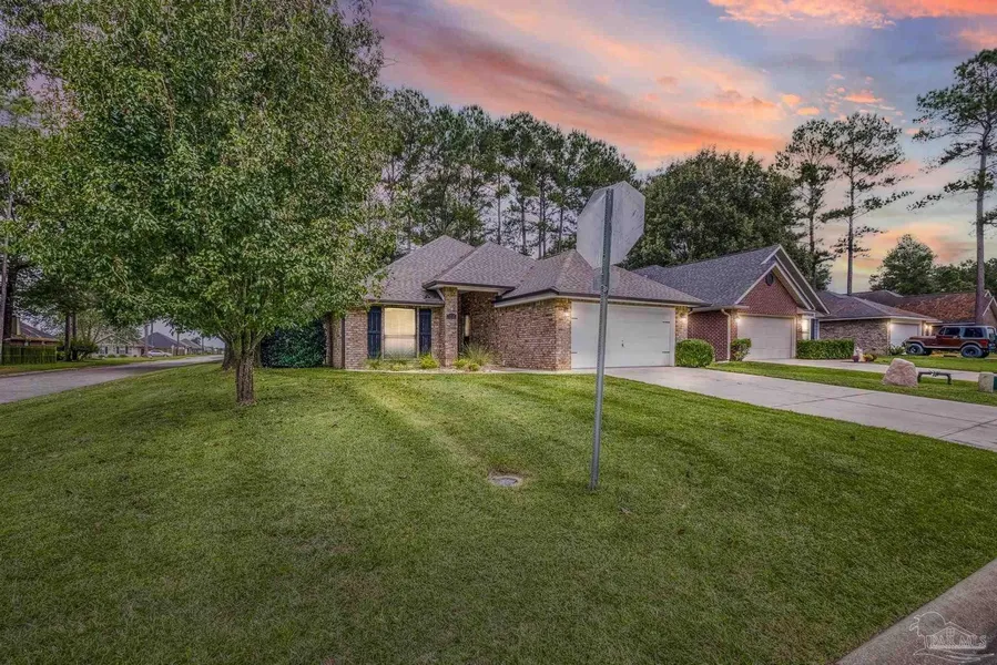 Welcome to this beautifully maintained 3-bedroom, 2-bathroom brick home in the highly desirable Pace, Florida area — offering the perfect combination of comfort, style, and functionality. Featuring an open floor plan, this home’s spacious living area flows seamlessly into a modern kitchen with dark granite countertops, a large breakfast bar, stainless steel appliances, and rich dark wood cabinetry — ideal for cooking, entertaining, or family gatherings. The primary suite provides a peaceful retreat with tray ceilings, custom lighting, and a large walk-in closet. The spa-inspired ensuite bathroom features a soaking tub, beautiful tile shower with glass door, granite vanity, and a private water closet. Two additional bedrooms offer plush carpet, ample closet space, and share a guest bathroom with granite countertops and a tub/shower combo. Step outside and enjoy true Florida living! The covered patio overlooks a fully fenced backyard with mature shade trees, a yard building for extra storage, and a well-kept lawn — perfect for kids, pets, and outdoor entertaining. Recent updates include a 1-year-old roof, a 3-year-old water heater, and beautiful hardwood floors throughout the main living areas. This move-in ready Pace home offers modern finishes, energy-efficient updates, and a peaceful setting just minutes from top-rated Santa Rosa County schools, local shopping, restaurants, and a short drive to the white-sand Gulf Coast beaches.