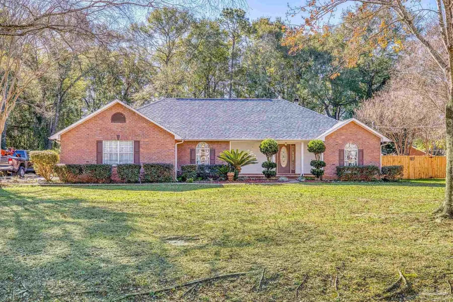Full brick pool home on a 1-acre lot with no HOA. This well-maintained, move-in ready property offers an open floor plan with cathedral ceilings, a built-in bookcase, and a fireplace. The formal dining area connects to the living room and a spacious kitchen featuring stainless steel appliances, abundant cabinet storage, generous counter space, a breakfast bar, and an eat-in area. Large windows and double sliding glass doors bring in natural light and open to a covered patio, lanai, and a 20'x40' inground pool—ideal for outdoor enjoyment. The large primary suite privacy in this split floorplan home, while including direct access to the backyard. The rear portion of the property is wooded, providing natural views and added privacy. Recent updates include a new roof (2025) and new fencing (2025). Additional features include a deep-well irrigation system, septic tank inspected and pumped in August 2025, utility shed, and a large driveway.