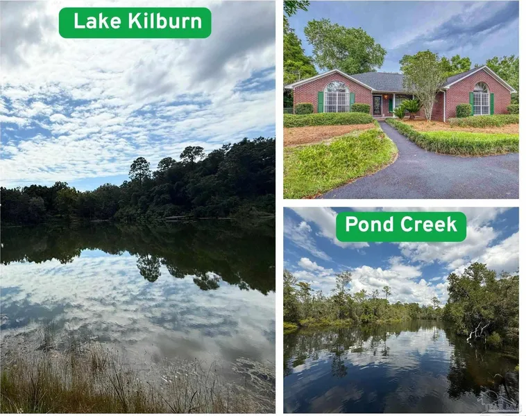 Nestled in the heart of Milton, Florida, this exceptional 9.84-acre estate comprises four contiguous parcels, offering unparalleled privacy and direct access to both Lake Kilburn and Pond Creek. With over 1,000 feet of combined waterfrontage, this property presents a rare opportunity for those seeking a tranquil retreat with convenient proximity to local amenities. The residence features a spacious 4-bedroom, 2-bathroom home designed for comfort and style. A welcoming front porch with an intricate glass front door leads into a bright and airy living room, complemented by high ceilings and abundant natural light. The versatile floor plan includes a large family room, den, or flex space, providing ample room for relaxation or entertainment. The updated kitchen boasts beautiful wood cabinetry with glass inserts, granite countertops, a dry bar area with a granite and tile backsplash, and new...