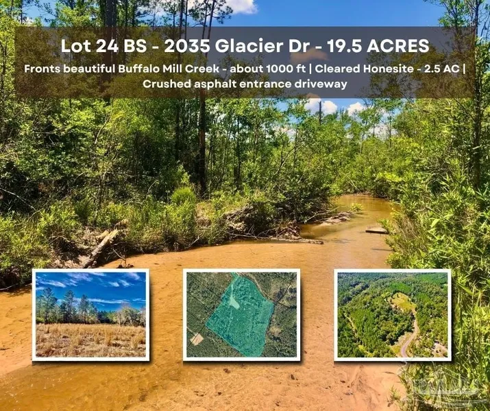 Lot 24 BS located on 2035 Glacier Drive is a large private parcel tucked away from the main Buffalo Ridge Rd. This 19.5-acre homesite with dimensions 745 x 1000 feet is situated on the east side of Buffalo Ridge Rd. What makes this parcel very special is an easy access to almost 1000 feet of Buffalo Mill Creek. This absolutely stunning creek is located on the east side of the lot and is there to enjoy it with this unique parcel. About 3 AC are cleared in the middle of the lot. Approximately 800 ft of crushed asphalt rd will take you from the entrance of the lot to the clearing. There is NO OTHER LOT IN BUFFALO RIDGE that offers such a beautiful creek with white-sand surroundings. This private parcel has plenty of space for the future house and additional outbuildings. Lot 24 BS is one the most private parcels not just in Phase 5 but in the whole Buffalo Ridge community. The clearing is surrounded by pine trees and oak trees. AT&T fiber optic is available. Some of the rarest land in Northwest Florida is now available for you to own in the planned community of Buffalo Ridge. Enjoy rolling hills, flowing creeks, beautiful oak trees, grassy meadows, and the unique serenity Buffalo Ridge Phase 5 parcels provide. Buffalo Ridge is located only minutes away from the convenience of Pace shopping and local restaurants. Situated on one of the highest points in Santa Rosa County, Buffalo Ridge provides twenty-mile views. The community has paved & curbed roads and AT&T fiber optic. Buffalo Ridge is designed to be a responsible residential development preserving West Florida natural beauty and wildlife. This special neighborhood offers privacy with convenience and provides stunning sunset views from its high elevation. Buffalo Ridge is situated about an hour away from The Gulf of Mexico including popular beach resort communities such as Pensacola Beach and Perdido Key.