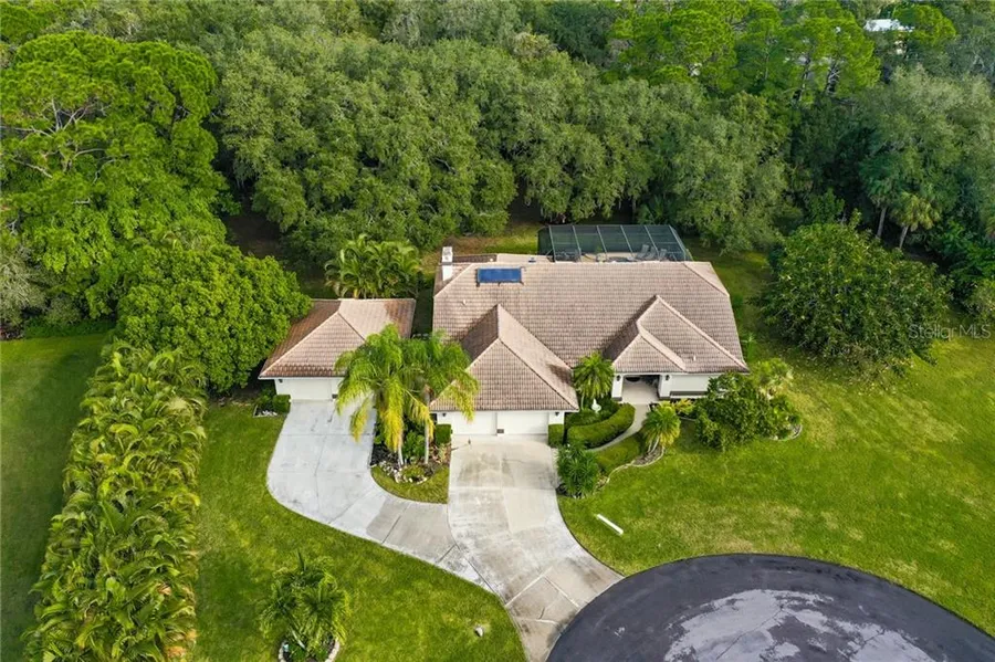 Private and secluded is the perfect setting for this 1 acre home in the popular community of Country Creek! Enjoy country living with light and bright rooms, neutral decor and tile floors throughout. This 3 bedroom 3 bath home features an updated kitchen with gorgeous wood cabinets, granite counters, newer appliances, and a breakfast bar open to the family room. Get cozy by the fire with this impressive wood burning fireplace with built ins and soaring vaulted ceilings. Retreat to the expansive master bedroom with sitting area and spacious master bath with his and hers sinks. This split floor plan includes generous sized guest rooms with guest bath. Enjoy Florida living as you relax by the pool/lanai with lots of covered space overlooking the park like backyard with tropical plantings, mature trees and the perfect blend of shade and sun. For the car/toy enthusiast the 4 car garage offers many options for additional parking and/or workshop with full bath. This cul de sac home has so much to offer with an extra large side yard and tons of off street parking. A rare opportunity to enjoy country living yet convenient to A rated school, shopping, restaurants, and the beach!