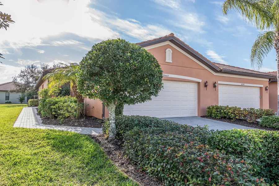 Sparkling, clean paired villa meticulously maintained and maintenance-free in Venetian Falls, a 55+ community for a highly active lifestyle. The home has two bedrooms, two baths plus den (could be third bedroom) with wood laminate flooring. Kitchen has granite counters, wood cabinets, stainless steel appliances and lovely breakfast area. Open plan living area has large ceramic tiles, crown moldings, slider doors to large, screened lanai for outdoor living. Bright home with lots of natural lighting, LED lighting in all fixtures except fan lights, three additional skylights and a Nest thermostat, which can be connected to WiFi for efficiency and other safety features. Inside laundry room with washer and dryer and a two-car garage. All new Kohler comfort height toilets. For added security, the home has shutters for all windows. Venetian Falls is known for its fabulous 16,000 square foot res...