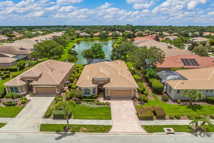 Stunning Lee Wetherington-built residence in popular Willowbend, directly across from the community pool. Well-appointed residence built to luxurious standards enjoys sweeping, long views of a shimmering lake. It is in perfect harmony with nature; including a hot tub/spa surrounded by a massive, extended 29-by-29-foot paver patio to enjoy outdoor living, in addition to a natural gas hookup for grill. Every detail is addressed with remarkable style: double-door entry, multiple tray ceilings, arches, extensive crown molding, sconce lighting, plantation shutters and tile with marble inlays. Paver drive and lovely curb appeal complete the ideal setting, where the moment you enter welcomes you with the breathtaking lake view. The extended Willow floor plan has spacious bedroom separation for privacy and den/office positioned at front of home with extensive built-in desk/cabinetry and bamboo flooring. The chef's kitchen is the heartbeat of the home, outfitted with high-end cabinetry, granite countertops, gas is available for easy conversion. So many features in this extraordinary home that is the perfect frame for an exceptional life. On a practical note: hurricane shutter protection, gas tankless hot water, extensive garage storage. Willowbend is a premier community with interconnecting lakes and the HOA fees include high speed internet, cable, yard maintenance, irrigation, community pool/spa, fitness, pickleball, basketball and playground. Fabulous location near Publix grocery, Kahwa Coffee shop, Legacy Trail, tiki bars, waterfront restaurants, Pine View School and between Sarasota and Venice.