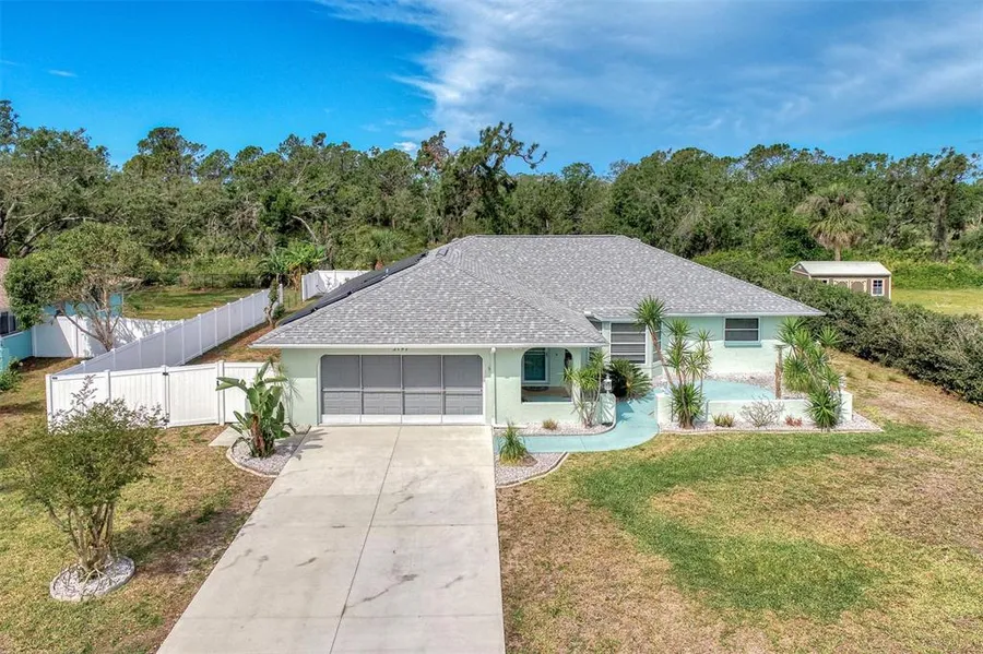 Attractive three bedroom, two bath, pool home on a large private lot, that backs up to the Manasota Scrub Preserve. The home features an open floor plan with a remodeled kitchen that features granite counter tops, stainless appliances, a breakfast bar, soft close cabinets and drawers and a large pantry. Sliders from your kitchen to your private lanai and pool where you can enjoy your morning coffee birdwatching and the butterfly garden or your evening drink watching the sunset. You can access the trail of the preserve right from your backyard. Split bedroom floor plan. The master bedroom and bath have a large walk-in shower and walk-in closet. The home has been well maintained and is move-in ready. The Tesla solar system was added in 2018 and has a 20 year production guarantee and overproduces enough electricity to heat your pool or charge your EV. The roof also was replaced in 2018. The AC system was replaced in 2019. Brand new driveway in 2022. You are just a couple miles away from Manasota Beach and the beautiful Gulf of Mexico. Come see this great home now!