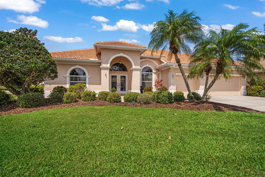 Extraordinary character is timeless in this Sawgrass residence, the beloved Aruba III floor plan, quality built by J & J Homes. An inviting home with lush landscaping, double door entry with arched transom window, three-car garage and sparkling 16-by-27-foot pool. Vaulted 12-foot ceilings, crown molding, detailed architectural trim, arches and wall niches. The kitchen is the heartbeat of the home, with views of the lanai, pool and beyond, perfect to relax in meal prep and cleanup. Solid cherry cabinets, stainless steel appliances, wide slabs of granite with center island and expansive breakfast bar. Formal dining room and dinette with aquarium window. Living and family rooms are spacious and incredibly light and bright. Split plan with primary bedroom that has pool access, walk-in closet and outfitted bath including dual sinks, Jacuzzi soaker tub and walk-in shower. On the opposite side of the house are two sizeable bedrooms, one with a walk-in closet and the second bath is positioned between them. Outdoor living is blissful with a large, covered lanai and a trickling fountain in the pool completes the serenity. On a practical note: new AC in 2018. Ideally located in the highly rated Sawgrass, where there are low HOA fees, no CDD fees and golf memberships are optional. Live securely in this extraordinary, gated community which has a community clubhouse, resort-style pool, fitness center, tennis, pickleball and golf. Minutes to downtown Venice, Gulf beaches, Legacy Trail, dining and shopping. So much to explore from a pristine home that will tug at your heartstrings.