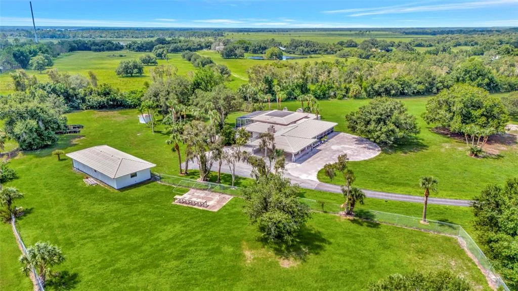 Under contract-accepting backup offers. PRICE IMPROVEMENT! This is your chance to own one of the most remarkable homes in Myakka Valley Ranches: Situated on 5 1/2 acres, the ca. 4,900 SF building has a wow factor, most obvious of which is the completely renovated 32 X 16 indoor pool set inside a 1,700 SF space! The rest of the house includes four bedrooms (2 master suites), 3 1/2 bathrooms, a spacious living room with a bay window, a family room with a fireplace, and a large, light and bright studio (or 4th bedroom) with a big fireplace that looks out over the pool and the front lawn. The kitchen features beautiful granite counters, wooden cabinets, S/S appliances (gas stove), and is conveniently located next to the pool, living room, and dining room. Outside, behind the French doors of the pool room, is an almost 1,000 SF screened deck. A 1,440 SF utility building/garage/barn with 3 overhead doors. The property is high and dry and would be ideal for horses, just add fencing. The house offers a lot of privacy, since it sits far from the road, and only one neighbor is visible from the lot. An interesting architectural detail is provided by the brick arches around the doors and hallways that lead to the pool and two bedrooms. Other features include a whole-house Kohler generator (2023) with a 1000-gallon in-ground propane tank. The pool can be heated with solar panels, and a heat pump. The property is less than a mile from State Road 72, and the local fire station, from where it is less than 30 minutes to reach the beautiful beaches of Siesta Key, or Downtown Sarasota with its many fine restaurants, concert venues, museums, all kinds of cultural happenings. Great public and private schools are not far away (the Out-Of-Door Academy, opened a new campus, just west of the "Valley" for pre-K-5 ). Myakka Valley Ranches is a wonderful equestrian-friendly community with saddle trails and lots of at least 5 acres. The home is located in Unit 1 of the subdivision, which is no longer subject to its governing documents. Use restrictions are dictated by Sarasota County's zoning regulations for OUE1 (Open Use Estate, one main residence every 5 acres). This designation does allow for some light commercial use, incidental to the property. Please, check with the zoning authorities to make sure that if you want to conduct a business, its nature will be compatible with the local zoning regulations. Finally, for those who love nature: the entrance to Myakka River State Park, Florida's biggest state park, is only 1.5 miles from the entrance to the subdivision. This park is a great place to hike, bike, kayak, or ride your horse. Bring your binoculars, and enjoy observing all the interesting critters that live in these 37,000 acres. Welcome to Myakka Valley Ranches, Sarasota's last frontier!