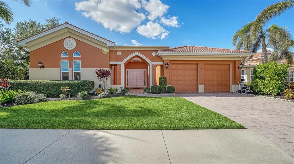Under contract-accepting backup offers. PRICED TO SELL!! LUXURY LIVING AWAITS IN THIS IMPECCABLE COURTYARD HOME!! Welcome to this HIGHLY COVETED, AMENITY-RICH home in the upscale community of The Venetian Golf and River Club. This stunning 3-bedroom, 2 1/2-bath courtyard pool home offers a blend of luxury and comfort, where every detail has been thoughtfully designed. Volume Ceilings, neutral colors, storage and tons of natural light is found throughout. The kitchen is a Chef's Dream with VIKING appliances including a dual temp wine refrigerator (2018), a BUTLER'S PANTRY with a separate sink and RO System, a breakfast bar and abundant cabinets and GRANITE counter space. The OPEN-CONCEPT floor plan seamlessly connects the kitchen, dining room, and family room, providing easy access to the private courtyard with a newly RESURFACED POOL/SPA, and waterfall feature (2022). The family room features a TRAY CEILING, two NICHE AREAS and spills into the kitchen and both outdoor areas seamlessly. The dining room is spacious has a million-dollar view of the GOLF COURSE and blends into the kitchen - making entertaining a breeze! The primary suite offers a serene retreat with luxury vinyl flooring, TRAY CEILING clerestory windows, a HUGE WALK-IN CLOSET, and a lavish ensuite bath with MARBLE countertops, double vanity, garden tub, walk-in shower with DUAL SHOWER HEADS, and direct access to the courtyard. The split-bedroom layout provides tons of PRIVACY. The spacious guest rooms feature large closets, luxury vinyl flooring, and an updated Jack and Jill bathroom with MARBLE countertops and step-in shower. The living room, currently used as an office/sitting room has an amazing view of the courtyard area where the POCKET sliders invite the outside in! The outdoor living space is just as exceptional, with a lanai offering hurricane screening and panoramic golf course views. Additional features include highly-rated PGT HURRICANE windows, sliders, and doors (2019/2020), a Culligan Whole House Carbon Filter (2018), hot water heater (2019), and a freshly painted exterior (2021). This home also includes a garage with an extra storage area, workbench and shelving. PRIVACY is in abundance with this lot too! Venetian Golf & River Club is located in the a HIGHLY-RATED SARASOTA COUNTY SCHOOL DISTRICT, offers a Clubhouse, Fitness Center, Resort & Lap Pool, Tennis Courts, PICKLEBALL, River Club Dining, Riverwalk for walking and biking and a guard at the entry gate. This community is centrally located to all Venice, Wellen Park and Sarasota have to offer: Gulf Coast Beaches, The Legacy Trail, Fine Dining, Shopping, Art, Theatre, Entertainment, Amazing Golf Course and so much more! Call for your tour today!