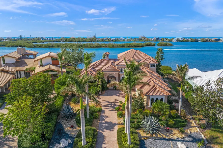 Under contract-accepting backup offers. This stunning waterfront residence in Southbay Yacht and Racquet Club is a gem on Florida's Gulf Coast where boats are accommodated in a deep-water marina for low fees. Boasting over 135 feet of water frontage and surrounded by lush tropical landscaping and majestic Royal Palms. Its refined curb appeal sets it apart as a one-of-a-kind property. The custom John Cannon home features a grand double door entry that opens to breathtaking wide open bay views. Inside, the home showcases high-end finishes and upgrades, including impressive, vaulted ceilings reaching up to 21 feet. You'll find abundant crown molding, elaborate tray ceilings, and exquisite wall finishes adorned with artfully painted faux designs and plantation shutters throughout. The home is designed for entertaining, with a full bar and wine room for guests, as well as an upper-level wet bar. The chef's kitchen is a culinary dream, featuring a spacious granite island, a gas cooktop with a pot filler, and views overlooking the pool, patio and bay. An upper-level bonus room offers versatile space for play, music, movies or exercise, all while enjoying some of the best views in the house. The main level primary suite is a serene retreat with a sitting area, two large closets and a luxurious bath that includes a garden shower, large tub, dual sinks, and a separate toilet and bidet. The expansive outdoor living spaces, including main level and upper terraces, are ideal for enjoying sunsets and observing local wildlife such as ospreys, dolphins, manatees and a parade of boats. Private dock for sunset viewing and fishing. Ideally between Sarasota and Venice, this residence is just minutes from the pristine sands of Siesta Key and Nokomis Beach. Convenience abounds with nearby shopping, dining the Legacy Trail, private and commercial airports, and top-rated schools, including the renowned Pine View School. This exquisite home embodies the essence of Florida living. Southbay Yacht & Racquet Club lives up to its name with a newly renovated community clubhouse, geothermal pool, gym overlooking the marina, banquet rooms, three tennis courts, four pickleball courts, a bocce ball court, two shuffleboards, basketball, kayak storage area, a waterfront park, 20 acres of common grounds and miles of trails. Ideally in between culturally rich Sarasota and charming Venice, minutes to beaches, Legacy Trail, No. 1 rated Pine View School, shopping, waterfront restaurants and Oscar Scherer State Park. Walk to your boat or take your golf cart around the neighborhood. For those who seek an exceptional waterfront life, nothing compares.