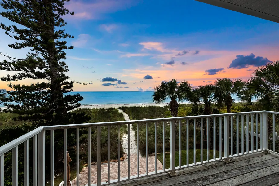 Discover the ultimate beachfront retreat at 409 Casey Key Road, a well-built residence offering the timeless charm of Gulf-front living paired with deeded boat access on the Intracoastal. This rare gem captures the essence of coastal luxury, complete with breathtaking Gulf views and direct beach access, all within a tranquil and private setting. Notably, this home has proven its resilience, sustaining only minor cosmetic damage and no flooding from recent storms, ensuring peace of mind for its new owners. Upon entering, you're greeted by a thoughtfully designed open floor plan with expansive Gulf views from multiple rooms. The main living spaces, including the living room, family room, dining room, and kitchen, are seamlessly connected, providing the perfect backdrop for entertaining or relaxing. Nine-foot ceilings, recessed lighting, and tile flooring throughout the first floor enhance the spaciousness and elegance of the home. The kitchen is a chef's delight, featuring white cabinets with pull-out shelves, stainless steel appliances, a gas cooktop, a counter-height breakfast bar, and under-cabinet task lighting. Adjacent to the kitchen, a cozy breakfast nook offers sliding glass doors that open to the patio, where you can enjoy your morning coffee while taking in the serene Gulf vistas. The primary owner's suite, a true refuge, features sliding glass doors that lead to a private balcony overlooking the Gulf. The en-suite bathroom is equipped with dual vanities, a soaking tub, and a walk-in tile shower. Additional bedrooms include private access to a Jack-and-Jill bathroom, while the ground-floor fourth bedroom offers its own exterior entry, making it an ideal in-law or guest suite. A dedicated office/den, accessed through double-entry glass-pane French doors, offers the perfect space for work or quiet reflection. Featuring built-in shelving, recessed lighting, and a ceiling fan, this room is both functional and inviting, ideal for those who need a private workspace or reading nook. Updates to the home provide peace of mind, including new HVAC units (2024), hurricane-rated impact windows and doors (2020), engineered wood LP SmartSide® siding (2020), a metal roof (2015), and a tankless water heater (2017). The home's 3-car garage features hurricane-rated doors, a workbench, and a climate-controlled storage room, perfect for a workshop, art studio, or workout space. Step outside to the expansive rear patio, where you'll find a private outdoor shower and panoramic Gulf views that frame stunning sunsets. Across the street, deeded dock access on the Intracoastal permitted for vessels up to 25 feet, offering unparalleled boating convenience. Additional highlights include a gas fireplace, buried propane tank, and a private gated entry with mature landscaping. Situated in a prime location, this home offers convenient bridge access to shopping, dining, and entertainment, and is within 15 minutes of the highly rated Pine View School for the Gifted. Embrace the coastal lifestyle at this extraordinary Gulf-front property. With its timeless design, unmatched location, and modern updates, this home is a rare opportunity to own a piece of Casey Key paradise.