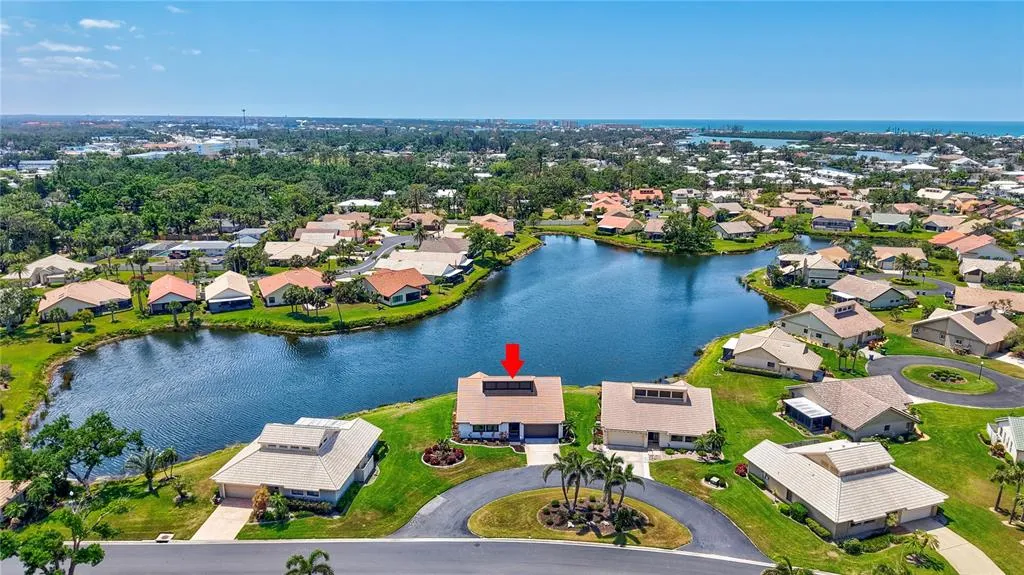 This property is the perfect combination of great location and fabulous home. Have you always wanted West of Trail with quick access to the best beaches? Just a short bike or golf cart ride will have you at the crystal-clear waters of Nokomis Beach, Sarasota County's oldest public beach, in minutes. Welcome to the hidden gem community of The Inlets. This gated enclave has lakes, boating canals, tennis and pickleball courts, a large heated pool and spa, exercise room, bocce ball, and loads of social activities. Entering your home through the double entry doors, the serene lake views welcome you from the moment you arrive at this fully renovated, custom designed home. Like the furnishings? The property comes with the brand-new furniture and all accessories. Vaulted ceilings, clerestory windows, walls of sliding glass doors, and an open floorplan are the perfect combination to show off this remarkable renovation. Luxury vinyl floors and 7.5" baseboards throughout the home allows one room to flow into the next. The kitchen has stunning quartz countertops, full quartz backsplash and stainless-steel appliances. White cabinets and countertops add to the openness of the home. A 5.5' by 10.5' pantry can be used as office space or can incorporate the washer and dryer. There is also a separate Florida Room in addition to a covered and screened patio overlooking the lake. The primary bedroom offers lake views and an en-suite bath with a custom walk-in shower and large walk-in closet. This property has two additional bedrooms and an update bath. And it's all NEW, NEW, NEW: impact windows, AC, interior doors, appliances, interior paint, flooring, lighting, insulation, exterior stucco, exterior paint, garage door, epoxy garage floor, front doors, and more. The tile roof is 2016. This property is located in Flood Zone X-500, It is the only property on the lake with a seawall. There has been no recent flooding or storm damage. The Inlets maintenance fee includes exterior insurance on the structure, Cable TV, Internet, Lawn and Bush Landscaping, Irrigation, Exterior Pest Control, and Seawall Maintenance. Don't wait to see this property in sunny Nokomis.