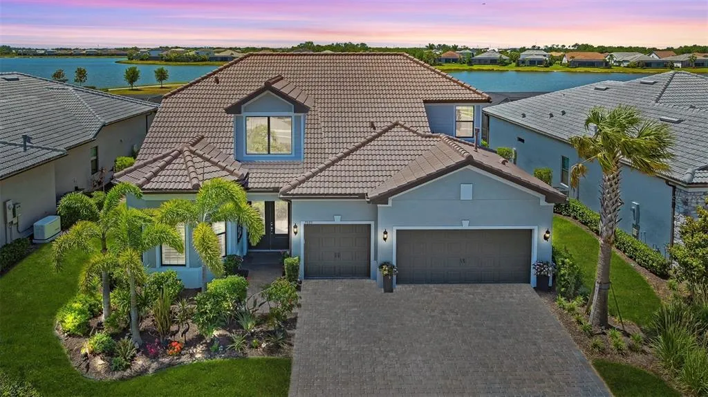 Positioned on a premium south-facing lakefront homesite with tranquil water views, this exceptional residence in Lakewood Ranch Waterside combines luxury, comfort, and versatility in one of the area's most desirable settings. The main level showcases a thoughtfully designed great room floor plan with soaring volume ceilings and custom coffered detailing, creating an open and inviting atmosphere. The kitchen serves as the heart of the home, featuring a large leathered quartz island with seating, a gas cooktop, stainless steel appliances, and an expansive walk-in pantry. Step outside to an impressive outdoor living space, where a saltwater pool and spa are perfectly screened with clear-view panels, maximizing the expansive lake views. The covered lanai offers generous space for both dining and lounging, creating an ideal environment for relaxation and entertaining. Inside, the primary suit...