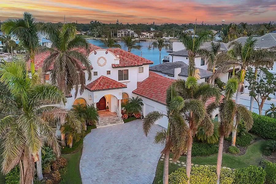 One or more photo(s) has been virtually staged. Step into a secluded, gated waterfront estate that epitomizes timeless elegance and offers unparalleled boating access, seamlessly blending sophistication with functionality. In exceptional San Remo Estates, this home boasts a prime location just moments from downtown Sarasota, Siesta Key and Southside Village. Designed by the esteemed Walter Hamm and built by Bill McGinness, the residence is engineered for longevity and stability, with construction resting on 54 concrete pilings. Positioned on a sprawling, private lot, the property offers breathtaking water views from every angle and features a deepwater harbor ideal for boating enthusiasts. The interior seamlessly flows with a bright, airy open floor plan that unites the living spaces and abundant natural light. Refined millwork, coffered ceilings, and a sophisticated blend of rich wood flooring and polished travertine set the tone for timeless luxury. The gourmet kitchen shines with an oversized island with quartz countertops, premium wood cabinetry, granite perimeter countertops and a subway tile backsplash. Top-tier stainless steel appliances and a cozy breakfast nook further enhance the space, while the adjoining family room creates an inviting atmosphere for everyday living. The formal dining room offers the ideal setting for hosting gatherings, while a private office provides an impressive workspace. The owner's suite on the main level is a sanctuary, featuring oversized windows with serene water views, two custom walk-in closets and a spa-like bath. Luxurious finishes include a floating vanity with illuminated mirrors, a freestanding soaking tub and an oversized walk-in shower. The second level is thoughtfully designed for comfort and entertainment, offering three generously sized bedroom suites, a TV/game room with a convenient kitchenette, and a balcony overlooking the pool and tranquil waterscape. Outdoor living is equally captivating, with an expansive travertine pool deck, a heated pool and spa installed in 2017, and lush, mature landscaping within a fenced and spacious yard, ensuring privacy and serenity. Anderson sliding doors and windows further amplify the home's upgrades and ambiance. A comprehensive renovation in 2015 elevated the home's sophistication, while modern updates, including a new roof in 2020, two updated air conditioning systems in 2023 and 202), and an ADT security system, provide peace of mind. Practical amenities such as abundant closet space, generous laundry facilities and provisions for an elevator further enhance the home's functionality. An oversized three-car garage ensures ample storage. Sought-after San Remo Estates is at the core of Sarasota, just before the north bridge to Siesta Key, and minutes to downtown Sarasota and Southside Village. This exceptional estate invites you to experience the pinnacle of coastal luxury living, where timeless elegance, modern convenience and breathtaking natural beauty converge in harmony.