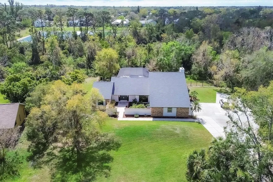 One or more photo(s) has been virtually staged. NO DEED RESTRICTIONS!! NO HOA! Welcome to this beautiful home nestled in a serene and private neighborhood. Situated on a tranquil dead-end street, this 1+ acre property perfectly blends rustic farmhouse charm with modern updates, creating a warm and inviting atmosphere ideal for both entertaining and everyday living. As you walk up the sidewalk and through the charming courtyard, you'll be greeted by double entry front doors, that open to a very large living room with French doors leading out to the expansive screened lanai. The lanai overlooks a tranquil private wooded area, providing a peaceful backdrop for outdoor relaxation or hosting friends and family. The outdoor space features a saltwater pool, spa, and a pass thru window from the kitchen, with French doors surrounding the pool for an added touch of elegance. The home boasts a ceda...