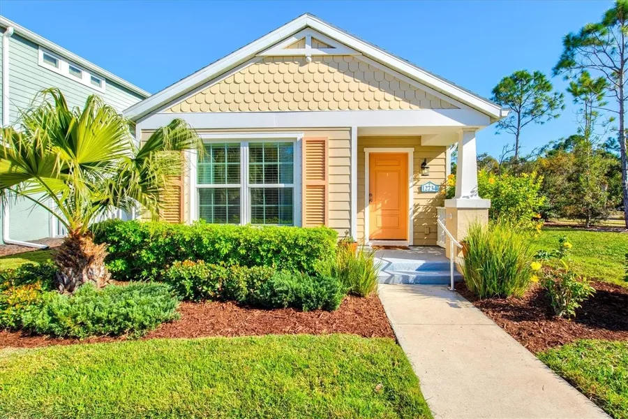 Under contract-accepting backup offers. Enjoy peaceful pond views and glowing sunsets from the front porch of this picture-perfect cottage, ideally situated on a desirable corner lot within the gated, resort-style Grand Palm community. This impeccably maintained two-bedroom, two-bath home with an attached two-car garage is spotless, move-in ready, and filled with abundant natural light throughout.