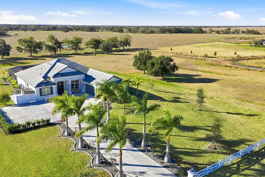 Welcome to a fairytale farmhouse where impeccable attention to detail defines this exquisitely crafted residence, set on a breathtaking about 5.28-acre homesite within the sought-after, gated community of Hampton Lakes. Designed for everyday living and entertaining, the split-bedroom open floor plan blends warmth, sophistication, and modern comfort. From the moment you enter through the grand double front doors, dramatic ceiling treatments, an architectural theme carried throughout every room, pair beautifully with newly completed custom paint and stunning millwork. The foyer features a striking herringbone European white oak ceiling, setting the tone for the layered ceiling details found throughout the home, including tongue-and-groove wood ceilings, custom beams and tray ceilings. The expansive eat-in kitchen offers quartz countertops, an oversized breakfast bar, stainless steel appliances, built-in oven, custom vent hood, pot filler, pantry and a charming dining nook. French doors open to a versatile bonus den or media room, while the oversized living room showcases about 11-foot tray ceilings, custom wood beams, built-in shelving and a statement electric fireplace. The resort-inspired owner's suite is a serene retreat with a beautifully detailed ceiling, dual walk-in closets with custom organizers, dual vanities, a soaking tub and a walk-in shower with frameless glass. Oversized picture windows capture peaceful views of the pool and pastures, with direct access to the lanai. Guest suites feature custom built-in closets and bunk spaces, while the guest bath is finished with grass-cloth wallpaper and a marble vanity. A spacious office with custom built-ins offers flexibility as a potential fourth bedroom. Throughout the home, 10-inch-wide European white oak floors, shiplap walls, elegant wainscoting and thoughtfully designed ceiling details reflect exceptional craftsmanship. Shadowbox sliders open to an extended screened lanai overlooking the custom saltwater pool and spa with spillover feature, heater, and panoramic enclosure, creating a private outdoor oasis. Notable upgrades include a Generac whole-home generator, a newly installed, underground 500-gallon propane system, and a Culligan whole-home water filtration system with reverse osmosis, along with dual HVAC systems, central vacuum plumbing, surround-sound prewiring and an interior utility room with built-ins. The exterior impresses with updated landscaping, exterior track lighting, a palm-tree-lined driveway with extension, a covered front porch with brick pavers, and a three-car garage with epoxy flooring and overhead storage. The expansive grounds include a citrus grove, a tranquil pond with fish, an extended concrete parking pad and a storage shed. Meticulously maintained and thoughtfully enhanced, this exceptional Fairytale farmhouse offers sweeping westerly sunset views while remaining just minutes from Waterside, Lakewood Ranch Main Street, downtown Sarasota, the interstate, the airport and world-class beaches.