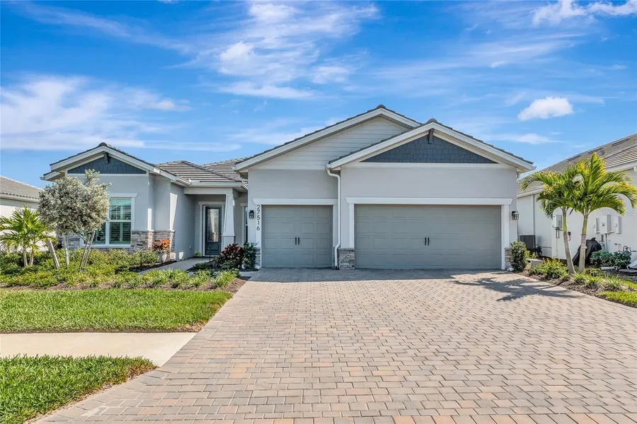 Welcome to this beautifully designed Stellar floor plan located ON THE WATER in the highly sought-after Beachwalk by Manasota Key community. ONLY 2.5 MILES TO THE BEACH. The exterior stone masonry, glass insert door & LED lighting give this home an inviting curb appeal. Plus the extra space on each side of the home adds to the allure. This home offers a bright, open concept layout that perfectly captures the Florida lifestyle, with seamless flow between living, dining, and kitchen spaces, ideal for both everyday living and entertaining. The kitchen is thoughtfully designed with ample cabinetry, generous counter space, GAS COOKING, and modern finishes, overlooking the main living area to keep everyone connected. WATER FILTRATION SYSTEM. Natural light fills the home. Decorative ceiling wood beams, accent wall & 8 FOOT DOORS adds to the elegance of this home. The spacious primary suite serv...