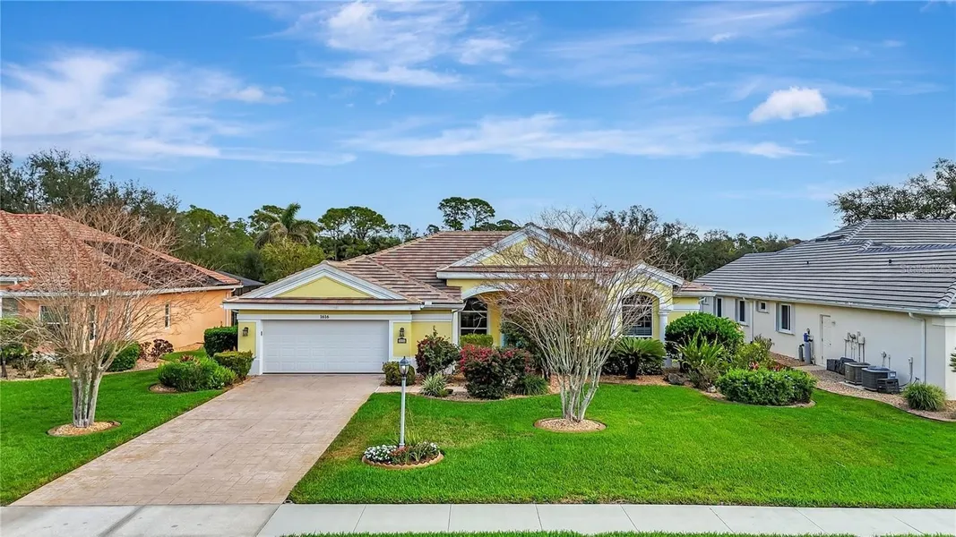 3D TOUR! Prepare to be impressed with this fabulous home in the beautiful, gated community of Bobcat Trail. This meticulously maintained 3 bedroom, 2 bathroom, POOL HOME is perfect for the entire family! The A/C is new (2024) and the ROOF in 2023 - talk about peace of mind! Pull into the driveway to be met with landscaping from the front to the back, including palm trees, pebble rock, curbing, lighting & the scent of flowers in bloom as you make your way up to the place you'll call "home." Open the front doors and be impressed with soaring high ceilings, plantation shutters, recessed lighting, arched entryways, crown molding & ceramic tile floors flowing throughout the main living areas making cleaning a breeze & pet friendly! Prepare dinner in the spacious chef's kitchen with beautiful cabinets, an abundance of countertop space, closet pantry, plant shelves, under cabinet lighting, ornate backsplash & kitchen island - BONUS - All the appliances are included in the sale! A well appointed breakfast bar highlighted by hanging pendant lights makes a great addition to this space, especially while entertaining. The formal Dining Room/ Den space can be closed off & features a built in desk that can be utilitized as cabinet space or a buffett area when hosting. The quaint dinette corner is a wonderful spot to sit & enjoy your morning coffee while getting ready to start your day . Adjacent to the kitchen is a large Family Room with built in alcove with a gas fireplace, aligned by windows & triple pocket sliding doors, allowing natural sunlight to shine through! What are you waiting for? Grab the popcorn & your family for a movie night in this cozy spot. The spectacular master suite is a true oasis, offering a generous walk-in closet, direct lanai access & an en-suite bathroom with dual sinks, private toilet, jacuzzi tub & Roman walk-in shower. The thoughtful, split floor plan, allows for privacy & functionality. Bedroom #2 is large in size & houses a private closet, large window & built in double desk, make-up vanity or dresser. Bedroom #3 features a private closet, window & ceiling fan. A well appointed guest bath is right outside of the bedrooms & provides plenty of space for family members & guests, designed with comfort & privacy in mind. The backyard is a private haven, showcasing a screened-in lanai & sparkling HEATED POOL that faces the WATER & WOODED VIEW - ideal for enjoying Florida's sunny days & warm evenings. The laundry room is off the kitchen & has an additional storage closet & wall cabinets to keep your items organized, don't forget about the OVERSIZED GARAGE, enough room for 2 cars & a golf cart! Bobcat Trail is a premier, gated community that is centrally located in North Port. You’ll be close to I-75 for easy commuting & just 15 minutes from downtown Wellen Park & the Atlanta Braves spring training stadium . Enjoy a day at the gorgeous Gulf