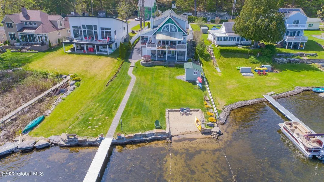 One-of-a-kind Saratoga Lake waterfront compound w/ 83' of lake frontage. This magnificent property has breathtaking views in every direction. A 2 bed/2 bath guest cottage AND a 3-level, 4 bed/3 bath main house makes up this prime lakefront property. Tucked away in coveted Green Acres community on the quiet side of lake. This property offers a sandy beach for swimming, dock for fishing/boating, large level yard for fun activities in a stunning setting. Impeccably maintained, main house boasts a spacious open floor plan, vaulted ceilings, custom woodwork, new kitchen-2021. Relax & entertain on expansive Trex deck & screen porch overlooking the gorgeous grounds & lake. New roof 6/22, driveway, Kitchens, stone wall. 3 sets washers/dryers. Profitable rental history. This property has it all!