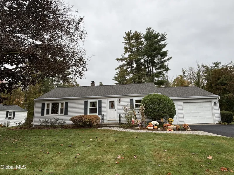 Welcome to this charming ranch home nestled on a quiet cul-de-sac in the Burnt Hills School District. Set on a park-like 3.3-acre lot, this property offers both privacy and a beautifully maintained setting. The exterior features vinyl siding, manicured landscaping, a paver walkway, and a new driveway that enhances its curb appeal. Step inside to a spacious living and dining room combination highlighted by a cozy gas fireplace-perfect for gatherings or quiet evenings at home. The efficient, fully applianced kitchen features quartz countertops and a sunny breakfast area and includes a pantry cabinet. ideal for enjoying your morning coffee. The full bath includes an updated tiled shower, adding a touch of modern style and comfort. The oversized garage is finished with durable epoxy flooring, providing a clean, polished look with plenty of room for vehicles, hobbies, or storage. The basement...