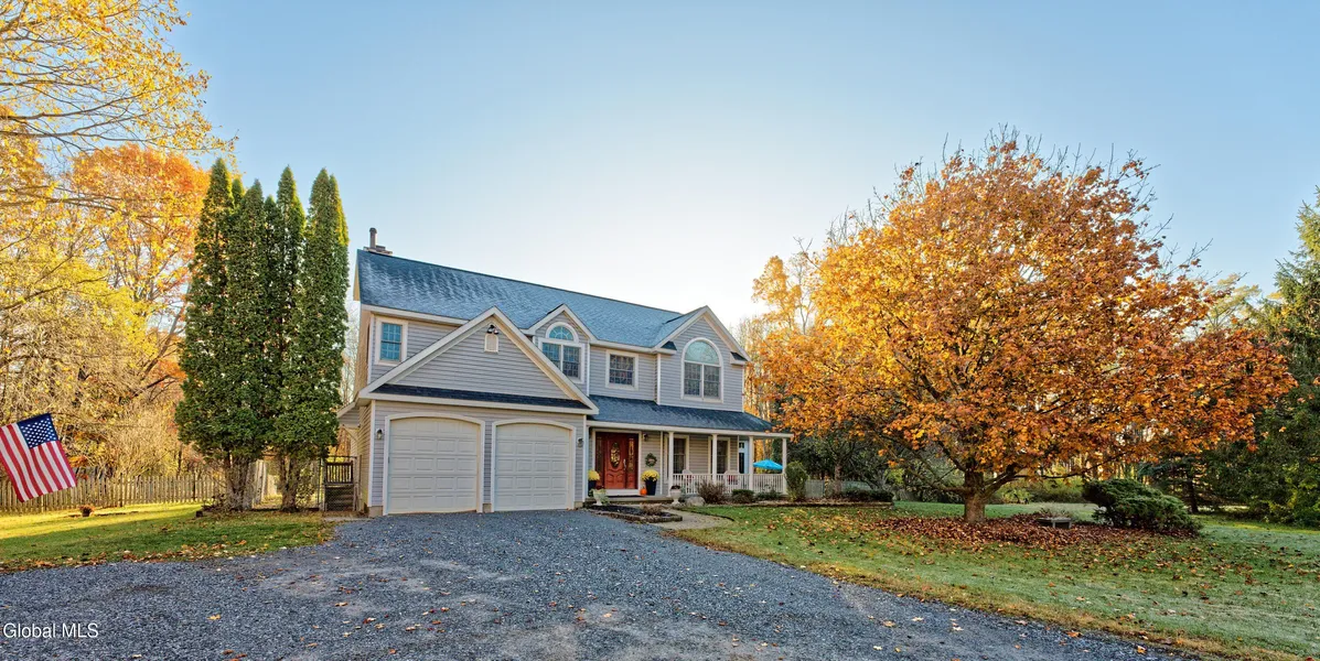 Step into the idyllic setting of this stunning 4-bedroom family home, nestled on a sprawling 16+acre lot that promises endless space for outdoor fun and adventure. This country home dazzles with its eye-catching windows and a wraparound porch that beckons you to unwind and savor tranquility. Inside, high ceilings and generous living spaces create an open, airy feel, starting with a grand two-story-high foyer that leads you into the heart of the home. The expansive living room transitions into a formal dining area, perfect for hosting dinner parties, with a massive deck that overlooks the backyard and kidney shaped in-ground pool. A southern faced sunroom welcomes a quiet retreat featuring floor-to-ceiling windows, that celebrate the 4 winds, a perfect spot for a tranquil reading retreat, or a vibrant indoor garden. The bright, airy atmosphere make this a truly remarkable extension of the home's living space. The elegant country kitchen opens to a bright breakfast nook-perfect for morning coffee surrounded by nature. The family room features a cozy corner fireplace, wet bar/coffee bar, built-in cabinetry, a dramatic 18-ft. vaulted ceiling with a view from the upper-floor balcony, and a stunning wall of windows that flood the space with light. Upstairs, the primary suite is a luxurious retreat with an 11-ft. vaulted ceiling, a breathtaking arched window, and two walk-in closets. Indulge in the skylighted primary bath with garden tub, separate shower, and dual-sink vanity. Three additional large bedrooms offer comfort and style, connected by a balcony that provides a view of the family room below. With an additional 2+ car garage for hobbyists, storing 4 total cars and toys, this country house is a perfect blend of elegance and practicality. Additional 4 acres adjacent to property is also available. There is also 4-5 acre field previously used to farm hay surrounded by trails for recreation. Close to Saratoga Springs, Amsterdam and Albany