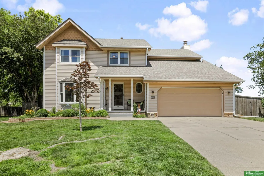 Spacious Bellevue 2-story with 3,000+ finished sq ft nestled in a low-traffic cul-de-sac with a south-facing driveway! This home offers plenty of space to spread out with 2 living areas on the main level, 2 dining areas, and a fully-finished basement. Kitchen features stainless steel appliances including a built-in double oven, updated light fixtures, and a gas-starter fireplace accented by original built in shelving. Main level walks out onto back deck overlooking the fully-fenced backyard, while the basement walks out onto a covered patio. 2nd floor includes 4 bedrooms, each one with a ceiling fan. Surrounding the home you'll find beautiful custom landscaping plus a shed. Enjoy lower-maintenance-living with newer vinyl windows on front of house, easy-care vinyl siding, newer water heater, Smart garage door opener, and new roof in 2023! All appliances stay, including basement deep freeze and washer/dryer (conveniently located on the 2nd floor.)