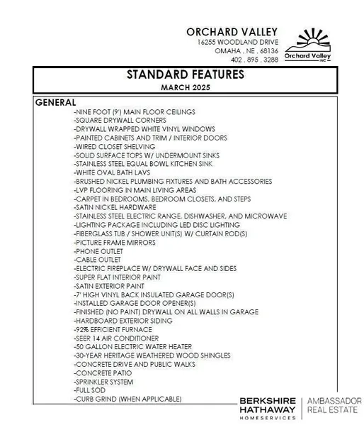 Aaron Horn, M: 402-612-5163, , - Orchard Valley Inc builds homes that work for real life — with room to grow, space to gather, and features families actually use. Located throughout the Omaha metro, these homes offer huge square footage at affordable prices, making them ideal for busy households. Open-concept layouts with 9’ ceilings create bright, connected living spaces, while durable LVP flooring handles everyday wear and tear. The kitchen comes ready with solid-surface countertops, painted cabinets, stainless steel appliances, and generous storage — perfect for weeknights or weekend hosting. Outside, enjoy a concrete patio, full sod, and sprinkler system, plus 92% energy-efficient heating and cooling to keep monthly costs predictable. From homework zones to movie nights, Orchard Valley homes are designed to support the way families live today. -More space for your family — without stretching your budget. All photos are artist renderings and